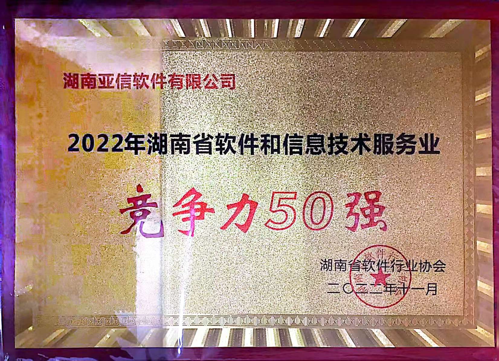 2022年11月 湖南亚信软件荣获“2022年湖南省软件和信息技术服务业竞争力50强”