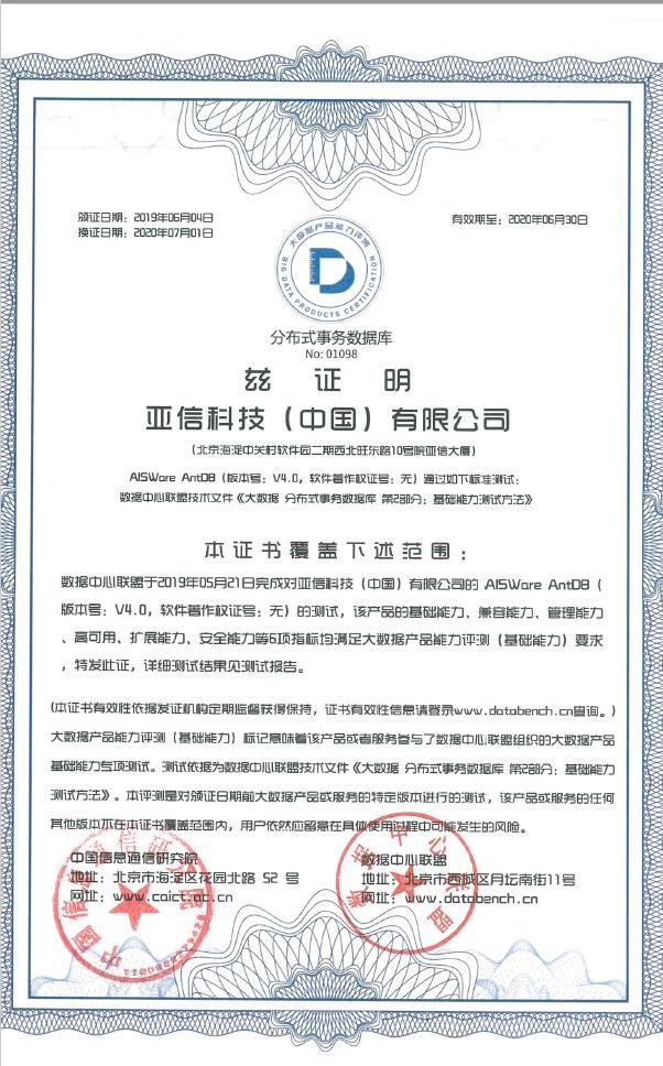 2019年6月 304am永利集团通过分布式事务数据库测试认证