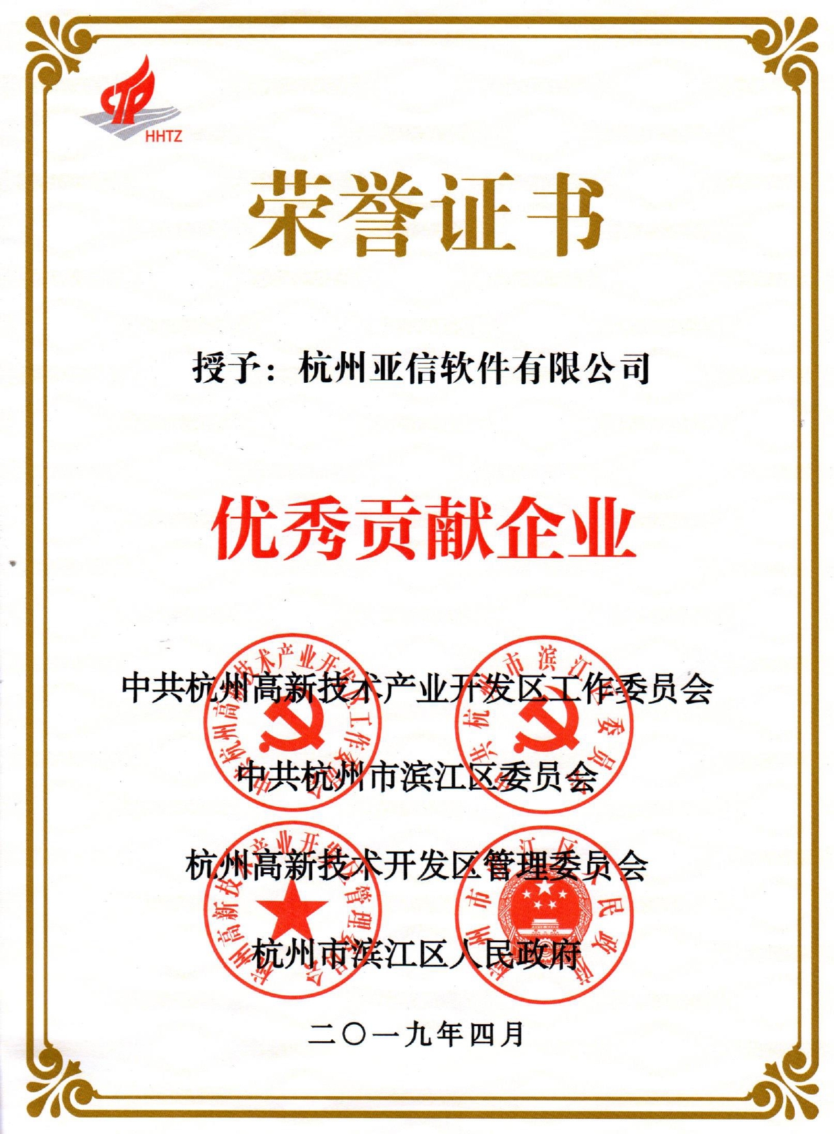 2019年4月 杭州亚信软件有限公司荣获“优秀贡献企业”